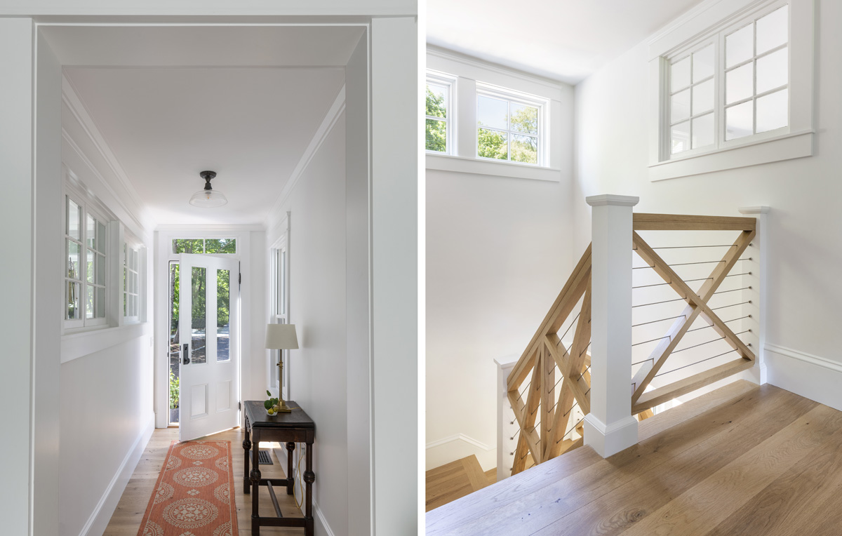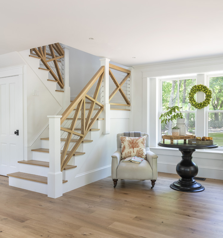 Structural elements like the staircase with oak cross buck railings emphasize craftsmanship and beauty in utility, a hallmark of the arts and crafts movement.