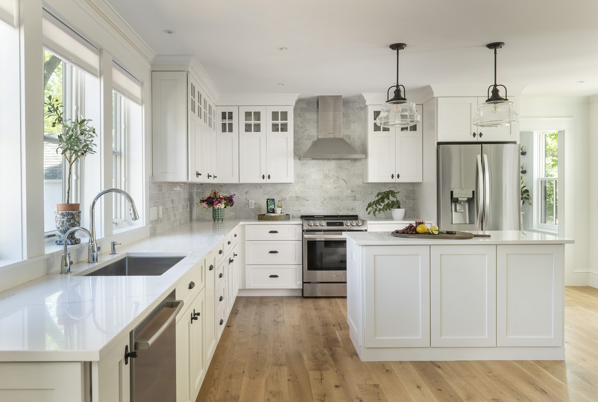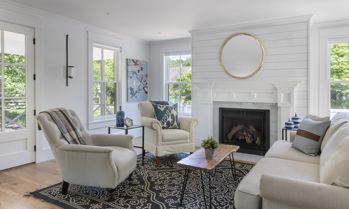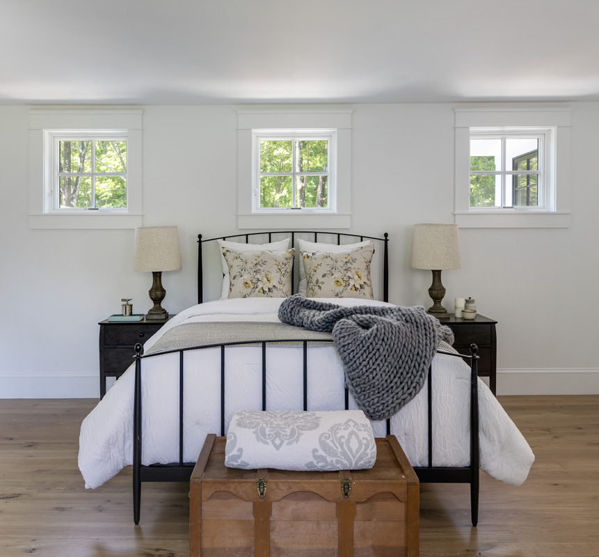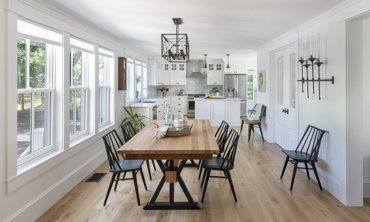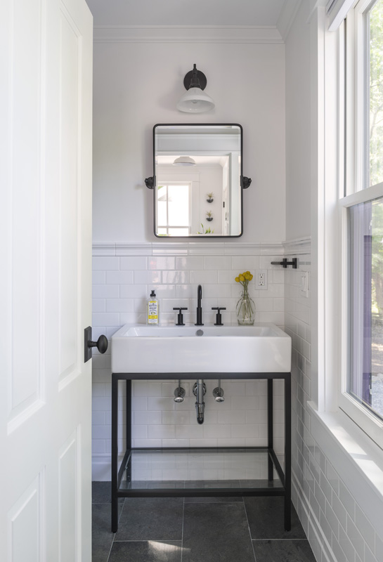 Black accents against white define the farmhouse aesthetic and connect elements throughout the home.