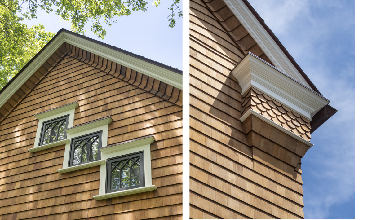 Custom cedar shingles—combining traditional and scalloped forms with hand-cut detailing—add subtle depth and rhythm to the home’s façade
